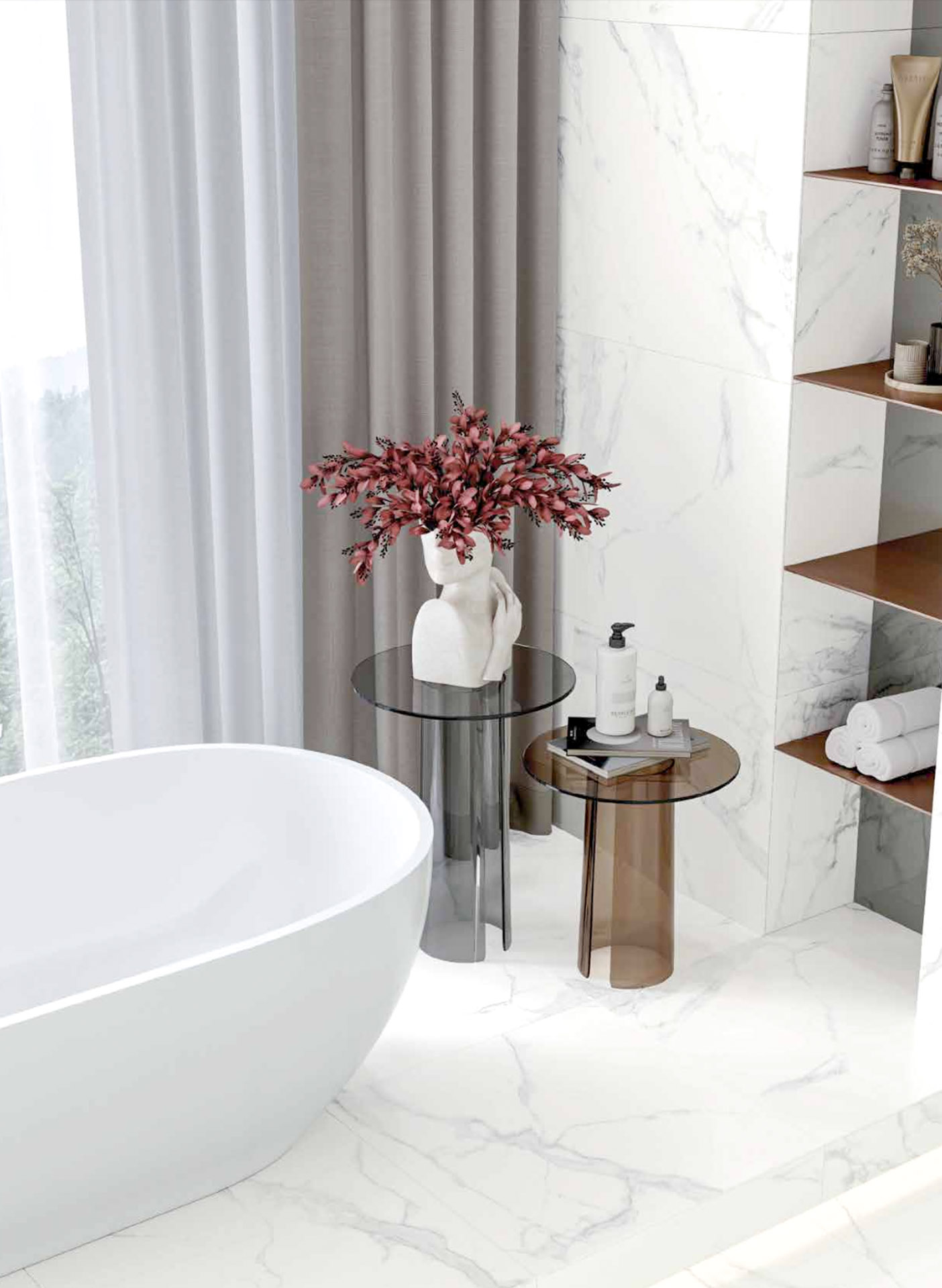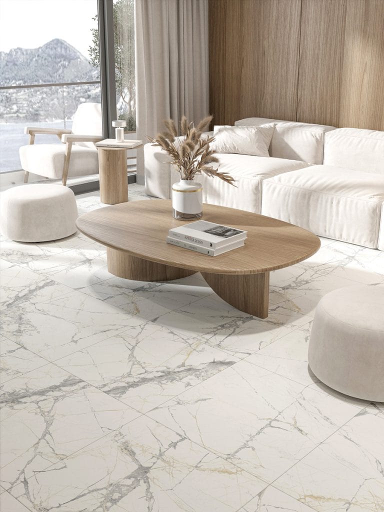 Cararra marble, perfectly depicted by ceramic tiles, takes you on a journey through centuries of its existence, giving an impressive appearance to the space it occupies. As an architectural cladding, this white and gray classic remains a popular choice in interior design, creating eternal elegance with its gentle shades.